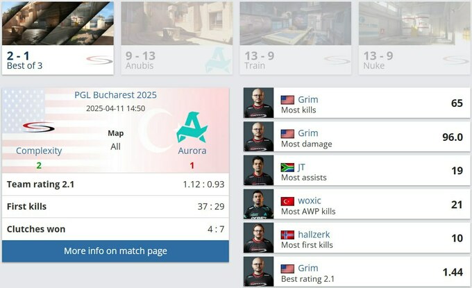 Команда Complexity одержала уверенную победу над Aurora в четвертьфинале PGL Bucharest, выиграв серию со счётом 2:1 и пробившись в полуфинал, где встретится с победителем пары G2 – Virtus.pro.