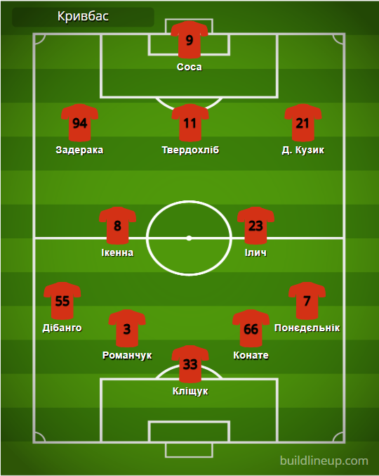 «Кривбасс»: Клищук – Дибанго, Романчук, Конате (Бандейра, 46), Понедельник – Икенна, Илич (Вакулко, 80) – Задерака (Ндомбази, 46), Твердохлеб, Д. Кузык (Каменский, 80) – Соса (Мулик, 86).