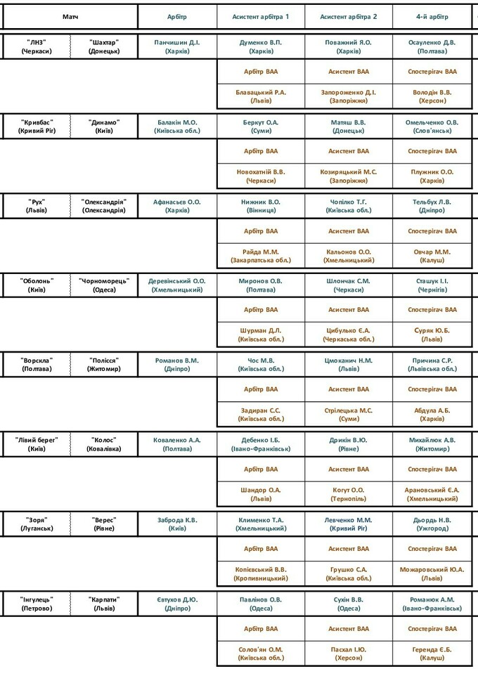 Комитеты Украинской ассоциации футбола назначили официальных лиц на очередной тур.