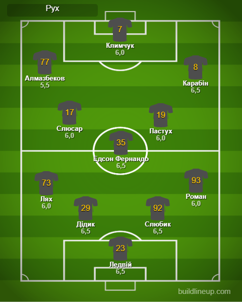 «Рух»: Ледвий – Лях, Дидык, Слюбик, Роман – Слюсар (Пидгурский, 57), Эдсон Фернандо (Рябов, 71), Пастух (Притула, 65) – Алмазбеков (Рунич, 46), Карабин, Климчук (Фаал, 64)