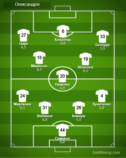 «Олександрія»: Ермаков – Мартынюк, Шабанов, Кампуш, Кравченко – Мишнёв (Смирный, 62), Ващенко (Шостак, 74), Шепелев (Козак, 74) – Цара (Беляев, 62), Безерра (Джевани, 18), Ковалец