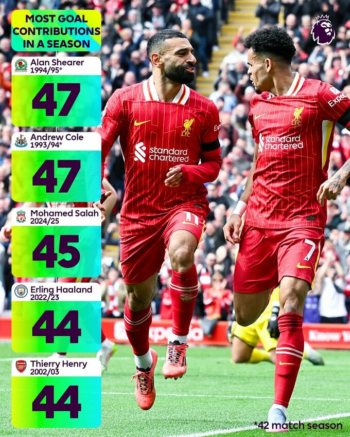Египтянин обновил рекорд Премьер-Лиги (продолжительностью сезона 38 матчей) по количеству результативных действий. На счету Салаха теперь их 45 (27+18).
