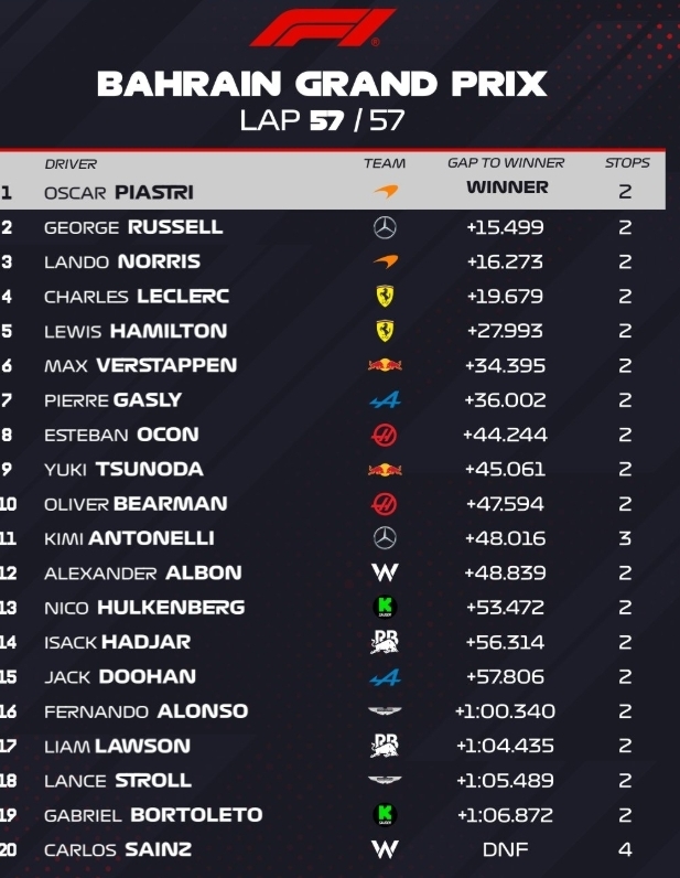 Состоялась гонка Формулы-1 в Бахрейне в рамках четвертого этапа сезона. Победу одержал пилот Макларена Оскар Пиастри, который стартовал с поула и не оставил соперникам шансов.