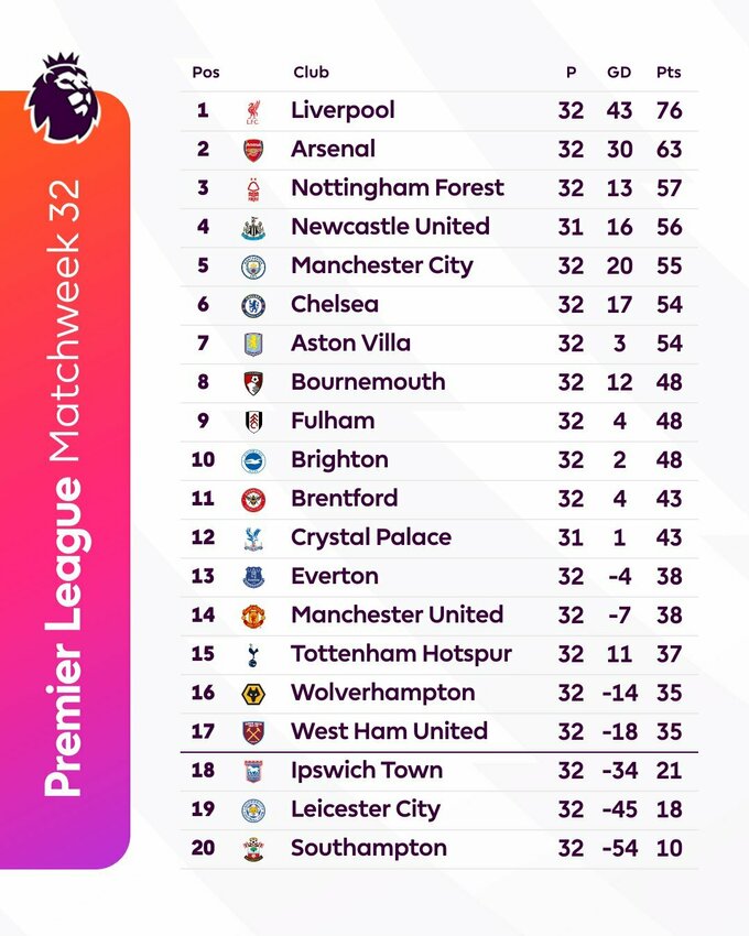 Топ-7 АПЛ: Ливерпуль (76), Арсенал (63), Ноттингем Форест (57), Ньюкасл (56), Ман Сити (55), Челси, Астон Вилла (по 54).