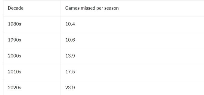 В среднем количество матчей за сезон, пропущенных из-за травм