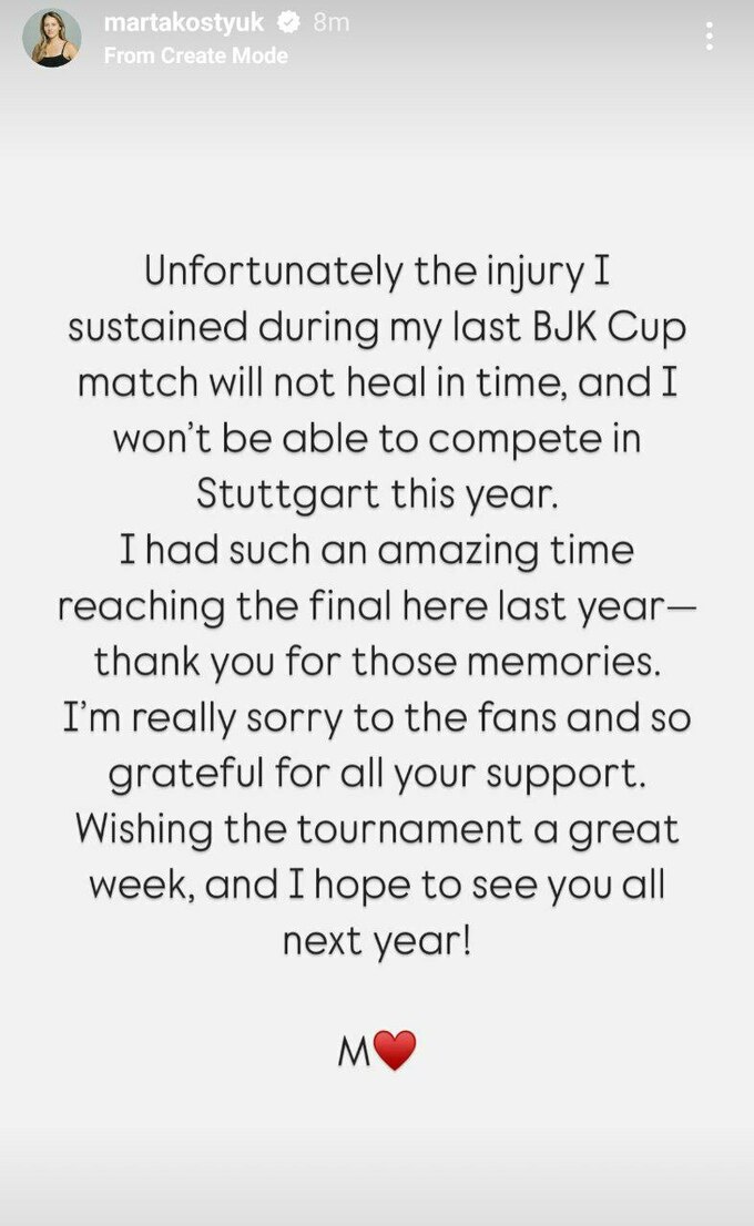 Вторая ракетка Украины Марта Костюк (WTA 25) отказалась от участия на грунтовом турнире WTA 500 в Штутгарте, Германия.