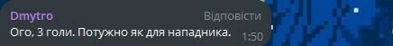 Dmytro: Ого, 3 гола. Мощно как для нападающего.