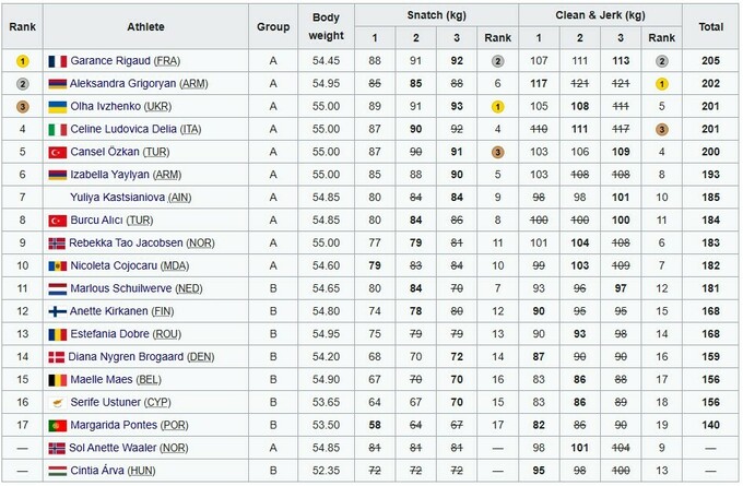 В итоге по сумме двух упражнений Ивженко набрала 201 кг и завоевала бронзу, опередив Селин Делию Людовику из Румынии благодаря лучшим дополнительным показателям.