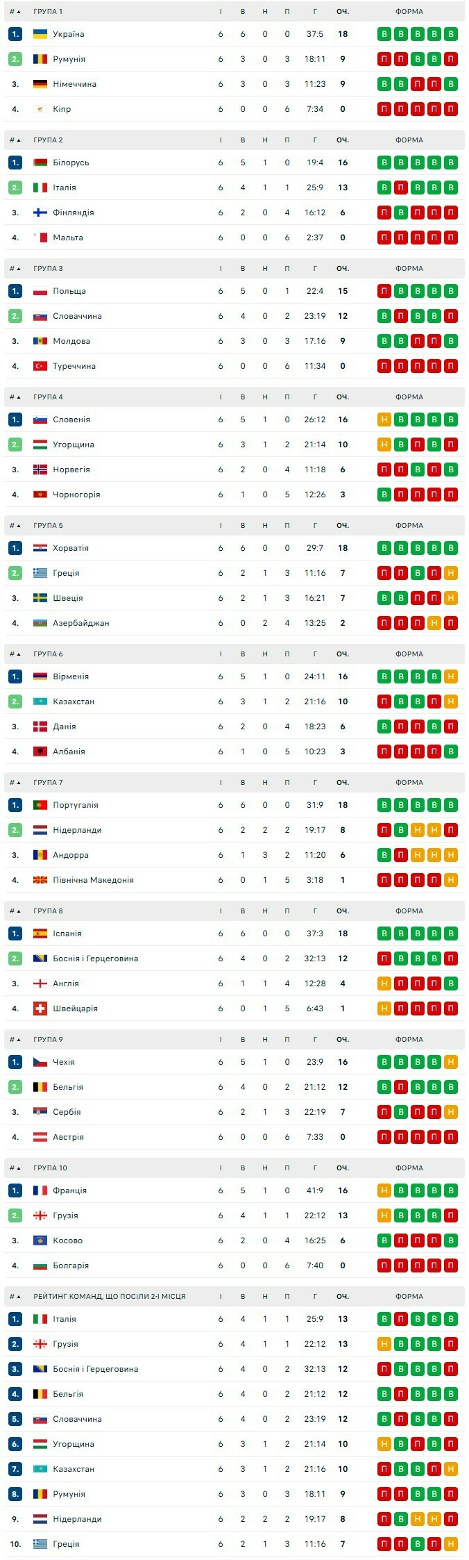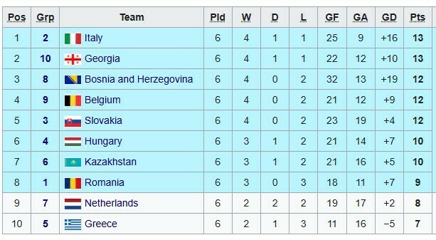 В плей-офф за оставшиеся 4 путевки сыграют 8 команд: Италия, Грузия, Босния, Бельгия, Словакия, Венгрия, Казахстан, Румыния.
