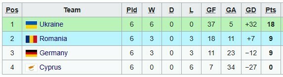 Сине-желтые уверенно победили в группе, впервые в своей истории одержав 6 побед из 6 возможных – над Кипром (7:0, 11:1), Румынией (2:0, 3:1) и Германией (5:3, 9:0).