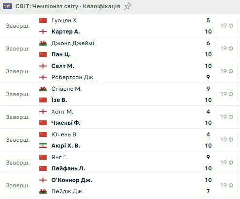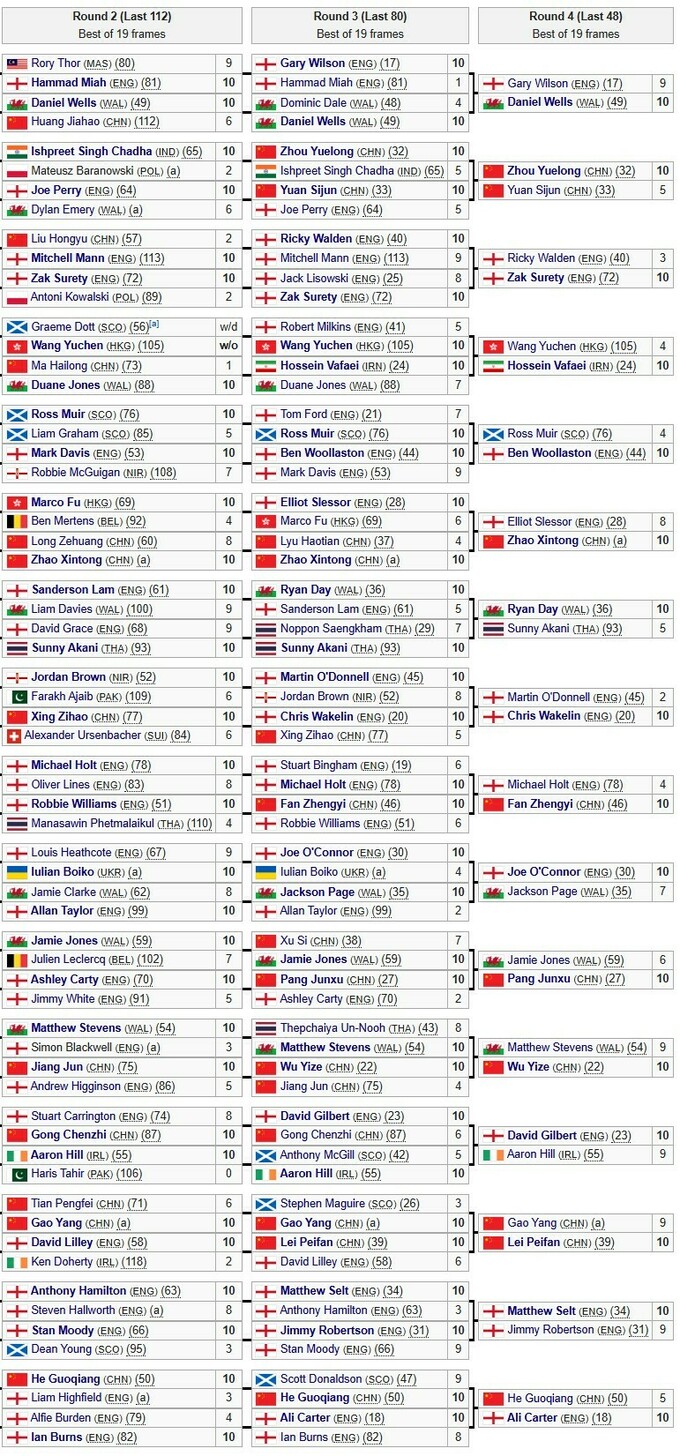 Али Картер, который признался, что рассматривал возможность сняться с турнира из-за боли в шее в предыдущем раунде, уверенно обыграл Хе Гоцяна (10:5). Фан Чжэнъи победил Майкла Холта со счетом 10:4, а Пан Цзюньсю обыграл Джейми Джонса – 10:6.