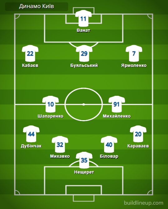 «Динамо» Киев: Нещерет – Дубинчак, Михавко, Биловар, Караваев – Шапаренко (Рубчинский, 71), Михайленко – Кабаев (Волошин, 64), Буяльский (Пихаленок, 70), Ярмоленко (Герреро, 64) – Ванат (Лучкевич, 81).