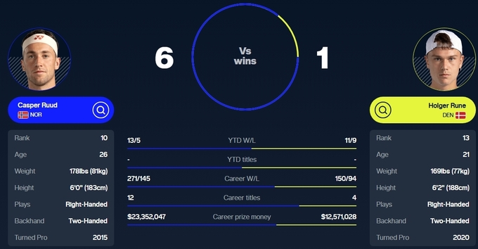 Интересное противостояние обещает быть между двумя представителями северной части Европы. Датчанин Холгер Руне и норвежец Каспер Рууд семь раз играли друг с другом на больших турнирах и шесть из них – на грунте. У Рууда в очном противостоянии явное превосходство над соперником: шесть побед против одной у Руне.