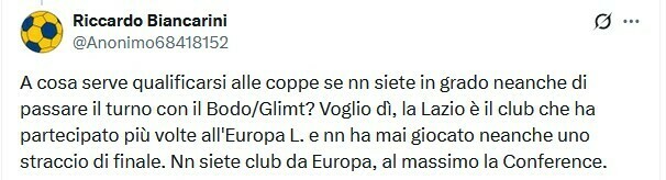Riccardo Biancarini: Какой смысл в квалификации на кубки, если ты даже не можешь пройти в следующий раунд против «Буде-Глимт»? Я имею в виду, что «Лацио» – клуб, который принимал участие в Лиге Европы больше всего раз и ни разу не играл в финале.