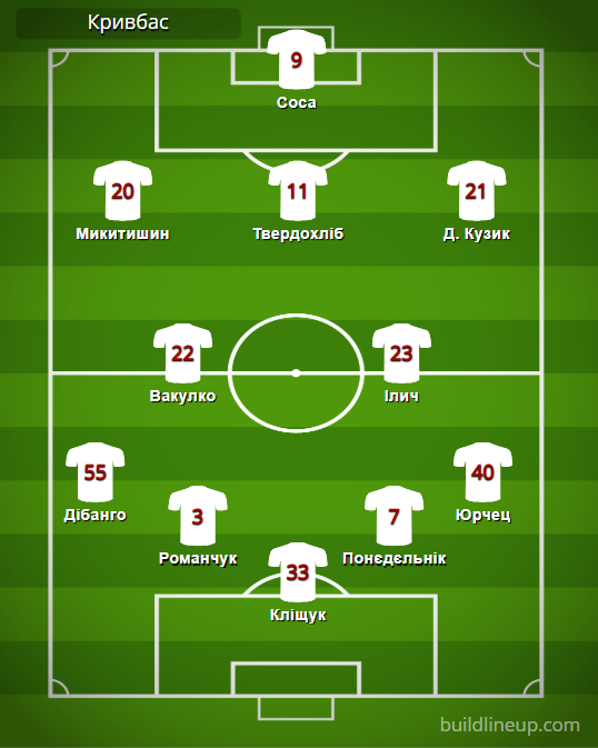 «Кривбасс»: Клищук – Дибанго (Задерака, 77), Романчук, Понедельник, Юрчец – Вакулко, Илич (Лунев, 75) – Микитишин (Ндомбази, 75), Твердохлеб (Каменский, 87), Д. Кузык – Соса (Мулик, 87).