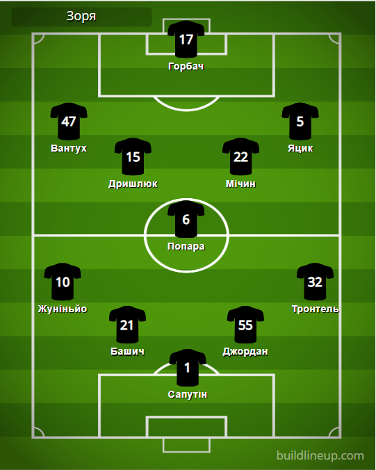 «Заря»: Сапутин – Жуниньо (Слесарь, 65), Башич, Джордан, Тронтель (Кирюханцев, 65) – Дрышлюк, Попара, Мичин (Антюх, 46) – Вантух, Горбач (Маткевич, 80), Яцик.