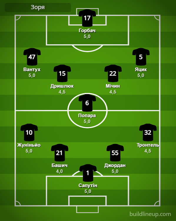 «Заря»: Сапутин – Жуниньо (Слесарь, 65), Башич, Джордан, Тронтель (Кирюханцев, 65) – Дрышлюк, Попара, Мичин (Антюх, 46) – Вантух, Горбач (Маткевич, 80), Яцик.