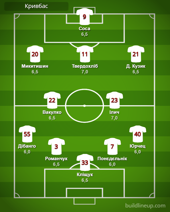 «Кривбасс»: Клищук – Дибанго (Задерака, 77), Романчук, Понедельник, Юрчец – Вакулко, Илич (Лунев, 75) – Микитишин (Ндомбази, 75), Твердохлеб (Каменский, 87), Д. Кузык – Соса (Мулик, 87).