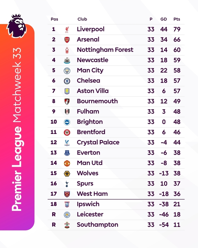 Арсенал на выезде разгромил Ипсвич (4:0) и занимает второе место (66 пунктов), опережая на 6 очков Ноттингем Форест, который вечером 21 апреля переиграл Тоттенхэм (2:1).
