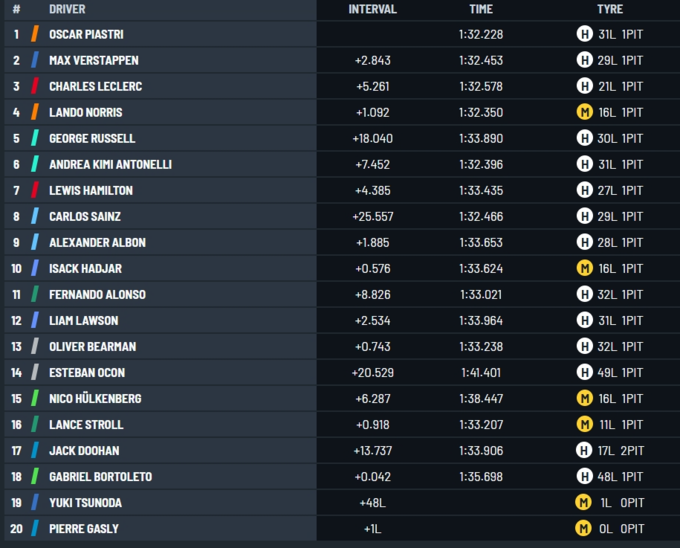 И на старте штраф в 5 секунд на пит-стопе получил Ферстаппен, который начал гонку с поула и в первом повороте срезал трассу и не дал Пиастри выйти в лидеры. Несмотря на хороший темп Макса, эти пять секунд стали ключевыми в тактической гонке с одним пит-стопом. После остановки Оскар вышел на первое место и не дал гонщику Ред Булла побороться за победу.