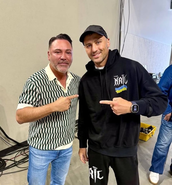 Накануне поединка с Холлоуэем боксера из Украины пришел поддержать легендарный экс-чемпион мира и руководитель промоутерской компании Golden Boy Promotions Оскар де ла Хойя. Он пожелал украинцу удачи в поединке, немного пообщался с ним и сделал совместное фото.