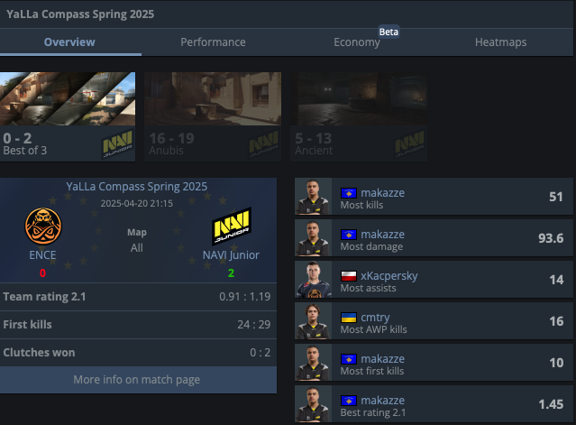 В финале makazze буквально уничтожил соперника на Ancient, завершив карту со статистикой 25-8 (K-D), рейтингом 2.23 и ADR 126.9, что окончательно обеспечило NAVI победу.