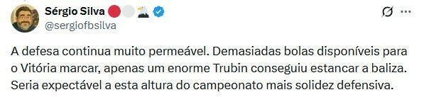 Sérgio Silva: Защита остается очень уязвимой. Слишком много моментов для Витории, чтобы забить, только выдающийся Трубин сумел удержать ворота в безопасности. На этом этапе чемпионата можно было бы ожидать большей надежности защиты.