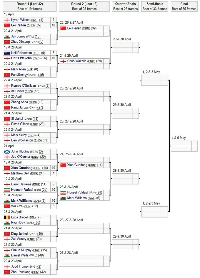 Заключительные сессии проведут: Джек Джонс (Уэльс)– Чжао Синьтун (Китай) – (2:7 после первой сессии), Марк Аллен (Сев. Ирландия) – Фань Чженъи (Китай) – (5:4 после первой сессии).