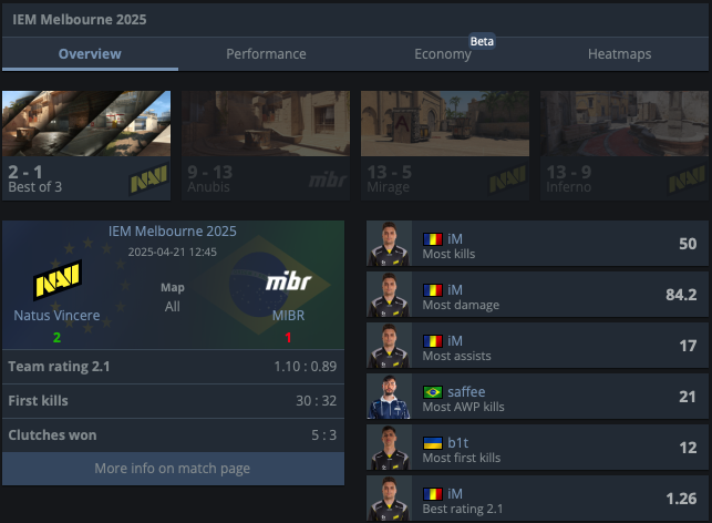Решающая карта Inferno началась многообещающе: NAVI взяли несколько стартовых раундов и выглядели весьма уверенно. Но после смены сторон игра украинской команды дала сбой — они начали уступать раунд за раундом, и MIBR почти сравняли счёт. Тем не менее, своевременные тайм-ауты и корректировки от тренерского штаба вернули игру в нужное русло. В итоге — 13:9 в пользу NAVI и первая победа в активе украинского коллектива.