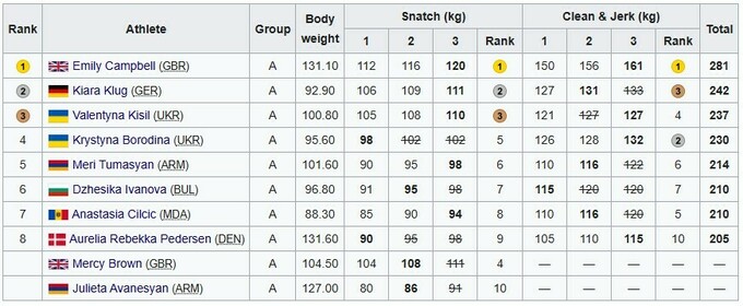 На чемпионате Европы по тяжелой атлетике, который проходит в Кишиневе, украинские спортсменки Валентина Кисиль и Кристина Бородина завоевали три награды в категории свыше 87 кг.