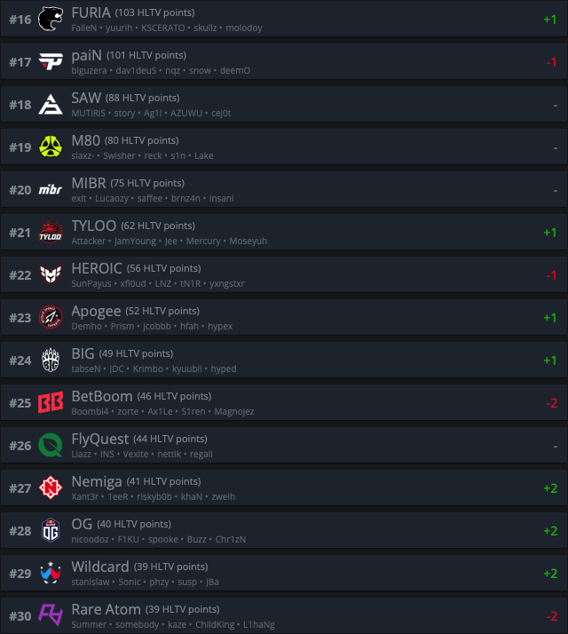 Команда TNL заняла пятьдесят вторую строчку, поднявшись на одну позицию. Leo опустились на шестьдесят девятое место, потеряв три позиции. FAVBET Team сейчас на восемьдесят шестом месте, что на пять строчек ниже по сравнению с прошлой неделей. Passion UA показали положительную динамику и поднялись на сто восьмое место, улучшив свой результат на три позиции.