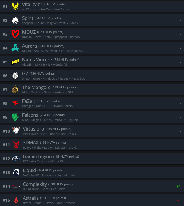 После очередного обновления рейтинга HLTV глобальных изменений в топ-15 лучших команд мира не произошло. Единственная перестановка — Complexity поднялись на четырнадцатое место, поменявшись позициями с Astralis, которые теперь занимают пятнадцатую строчку.