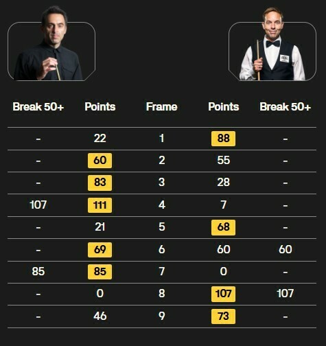 Вторая сессия матча состоится в среду, 23 апреля, в 16:30 по киевскому времени. Ронни ведет 5:4, игра идет до 10 выигранных фреймов.