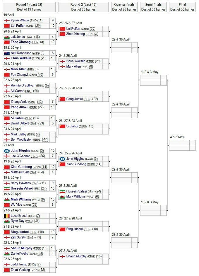 - 21:00. Джадд Трамп (Англия) [2] – Чжоу Юэлун (Китай) – 6:3 (после первой сессии)