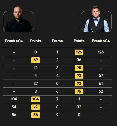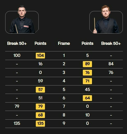 Однако в 9-й партии Марк продемонстрировал великолепный клиренс-брейк в 135 очков, что позволило ему выиграть третий фрейм подряд.