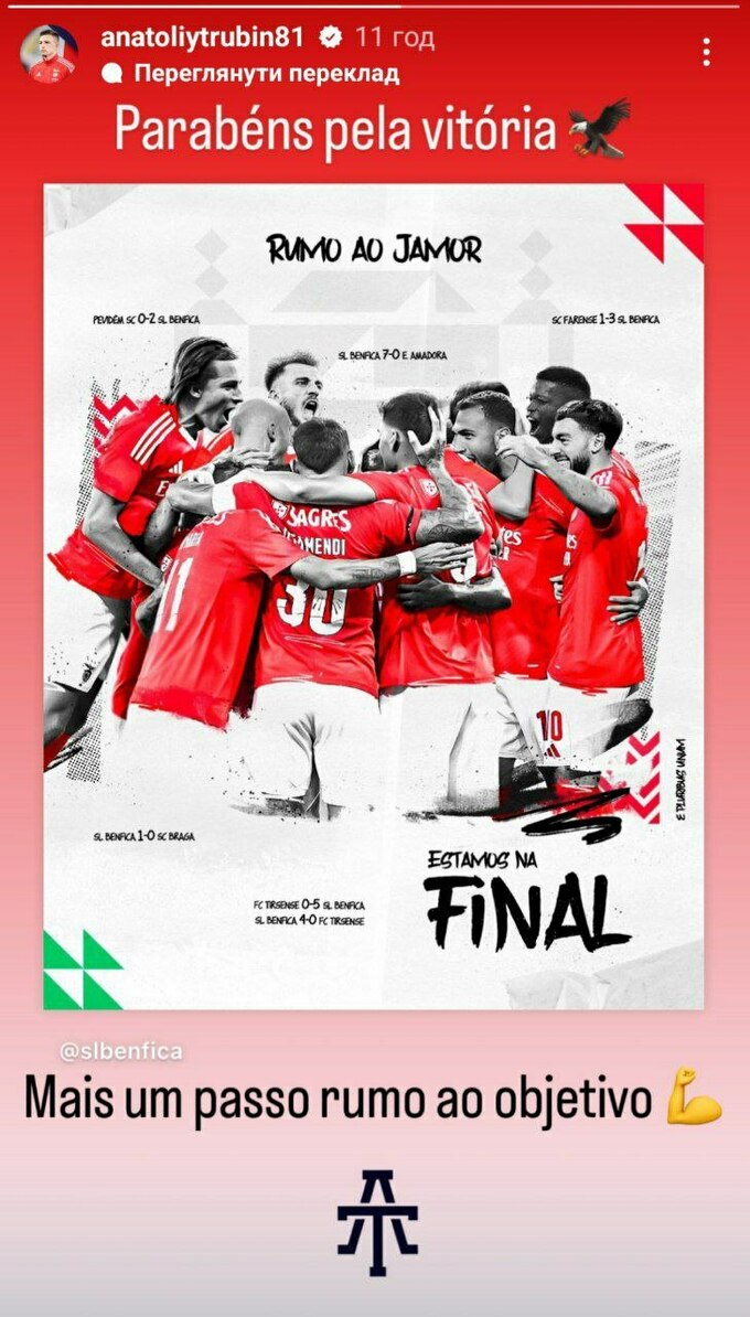 Украинский вратарь «Бенфики» Анатолий Трубин в социальной сети Instagram прокомментировал выход лиссабонского клуба в финал Кубка Португалии.