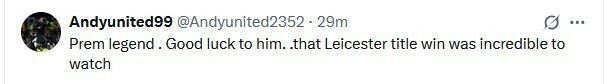 Andyunited99: Легенда Премьер-лиги. Успехов ему. …невероятно было наблюдать за победой «Лестера» в чемпионате.
