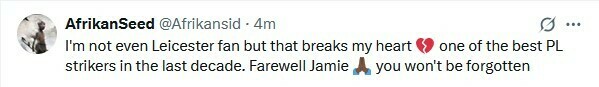 AfrikanSeed: Я даже не фанат Лестера, но это разбивает мне сердце. Один из лучших нападающих Премьер-лиги за последнее десятилетие. Прощай, Джейми. Тебя не забудут.