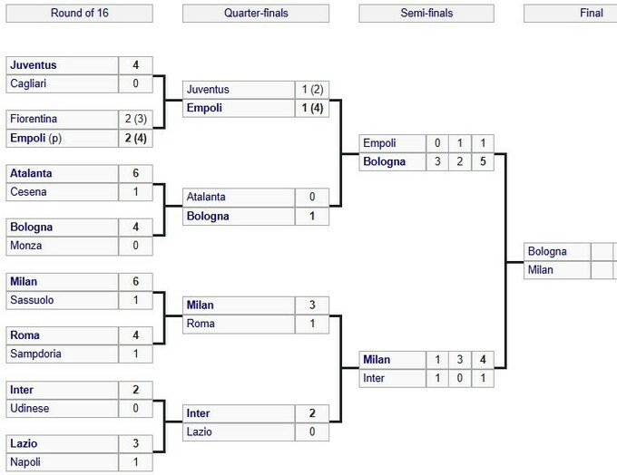 В решающем матче Кубка Италии 14 мая в Риме сыграют Болонья и Милан, который ранее в дерби переиграл Интер (1:1, 3:0).