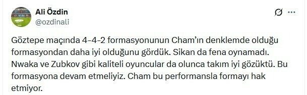 Ali Özdin: В матче в Гезтепе мы увидели, что расстановка 4-4-2 была лучше, чем расстановка с Чамом. Сикан тоже сыграл неплохо. Команда выглядела хорошо с такими качественными игроками, как Нвакаэме и Зубков. Мы должны продолжить использовать это формирование. Чам не заслуживает стартового состава с таким выступлением.