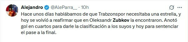 Alejandro: Несколько дней назад мы говорили о том, что Трабзонспору нужна звезда, а сегодня подтвердилось, что они нашли ее в лице Александра Зубкова. Он забил гол в четвертьфинале, обеспечив своей команде выход в финал, а сегодня обеспечил им место в финале.