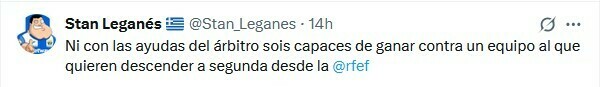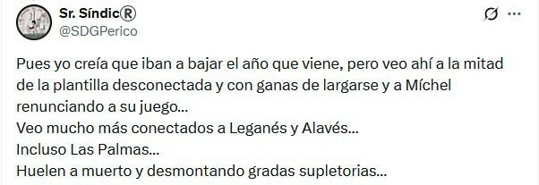 Sr. Síndic: Ну, я думал, что они вылетят в низшую лигу в следующем году, но я вижу, что половина команды отошла от дел и горит желанием уйти, а Мичел сдался... Я вижу, что Леганес и Алавес гораздо более связаны… Даже Лас-Пальмас… Они пахнут смертью и демонтажем лишних трибун…