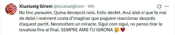 Xiuxiueig Gironí: У меня нет слов. Какое разочарование, ребята. Я сломан. Сегодня это действительно больно, и сложно представить, что мы сможем отреагировать после этого матча. Нам нужно чудо. Во всяком случае, я не планирую сдаваться до конца. ВСЕГДА С ВАМИ, ЖИРОНА.