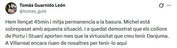 Tomás Guarnido León: Мы выбросили в мусорку 45 минут. Мичел подавлен этой ситуацией. И было доказано, что задницы Порту и Стуани приносят больше пользы, чем виртуозность, которой, по мнению Данджумы, он обладает. В Вильярреале над нами до сих пор смеются за то, что он здесь.