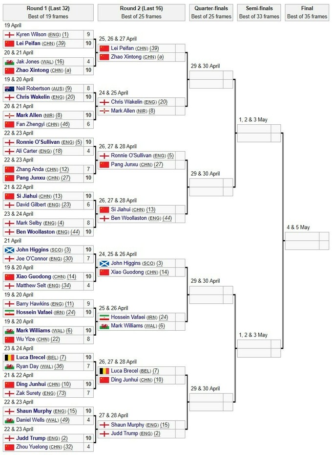 - 16:30. Джон Хиггинс (Шотландия) [3] – Сяо Годун (Китай) [14] – 8:8 (вторая сессия)