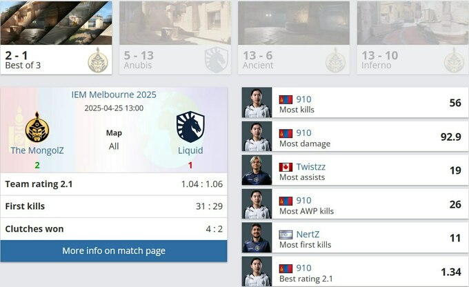 Судьба матча решалась на легендарной третьей карте – Inferno. Здесь обе команды показали максимум, а борьба шла за каждый раунд. Liquid начали с пистолетного раунда, но после закупа The MongolZ перехватили инициативу. Особенно выделился Усухбаяр «910» Банзрагч, который уверенно действовал с AWP и вывел свою команду вперёд 7:3.