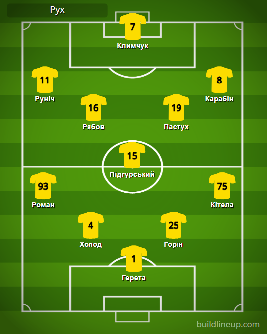 «Рух»: Герета – Роман, Холод, Горин, Китела – Рябов (Джурабаев, 90+2), Пидгурский, Пастух – Рунич (Алмазбеков, 64), Климчук (Фаал, 52), Карабин (Ременяк,64).
