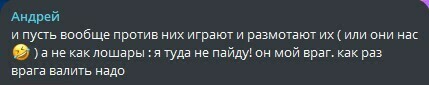 Андрей: И пусть вообще против них играют и размотают их (или они нас) а не как лошары : я туда не пайду! он мой враг. Как раз врага валить надо.