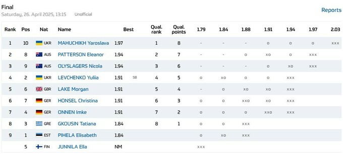 Второе и третье место заняли австралийки Элеанор Паттерсон и Никола Олислагерс (по 1.94), которые в марте на ЧМ-2025 в помещении опередили Магучих.