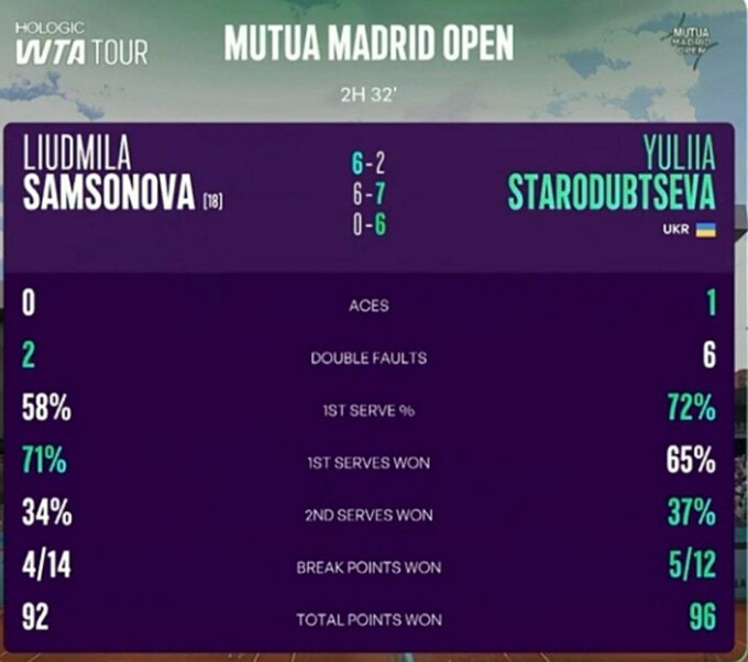 Украинская теннисистка Юлия Стародубцева (WTA 99) пробилась в 1/8 финала грунтового турнира WTA 1000 в Мадриде, Испания.